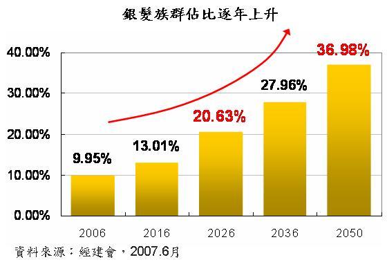 台灣地區2026年,老年人口將攀升到20%,也就是說,每5人之中,就有一位是銀髮族!到2050年,每4人之中,就有一位是銀髮族!