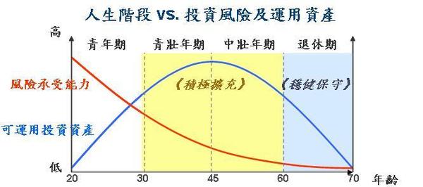 →青年、青壯年(約20~45歲):風險承載度較高,在資產配置方面可以選擇較高報酬的高風險商品,但由於所擁有的資產相對較少,故獲利也較有限。
